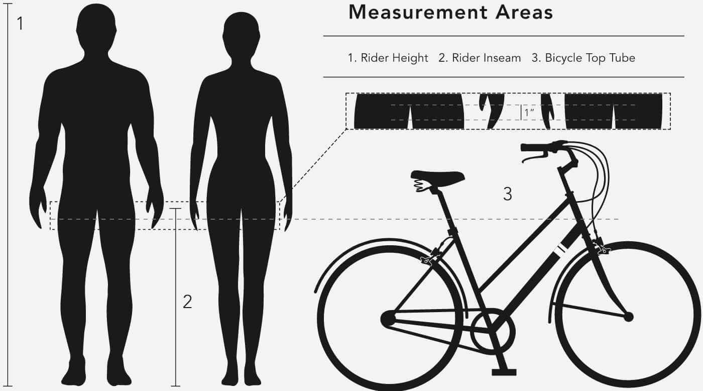 • INSEAM MEASUREMENT: Perpendicular measurement from the floor to your groin, also known as your “Stand Over Hight”. Please note that you will want at least 1 inch or more of clearance over the top bar, when straddling the bike with your feet flat on the floor.